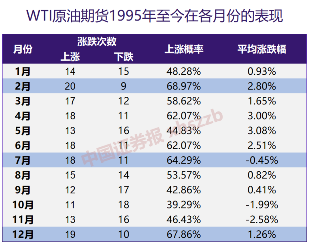 值得一提的是,历史数据显示,原油价格在7月上涨概率较大。统计WTI原油多年来各月份的表现,可以发现,上涨概率超过60%的月份是2月份、7月份和12月份。