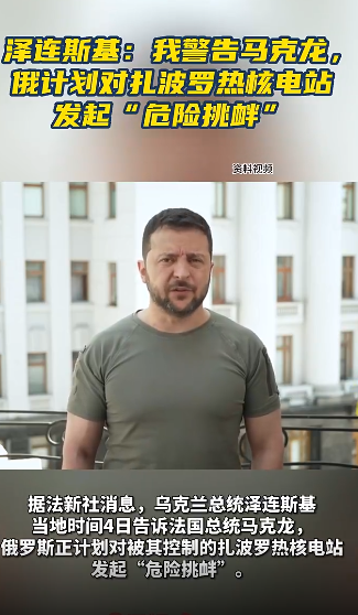 报道称,泽连斯基在一份声明中说,“我警告埃马纽埃尔·马克龙,占领军正准备在扎波罗热核电站发起危险挑衅行动。”他还称,“我们同意与国际原子能机构一起,最大限度地控制局势。”