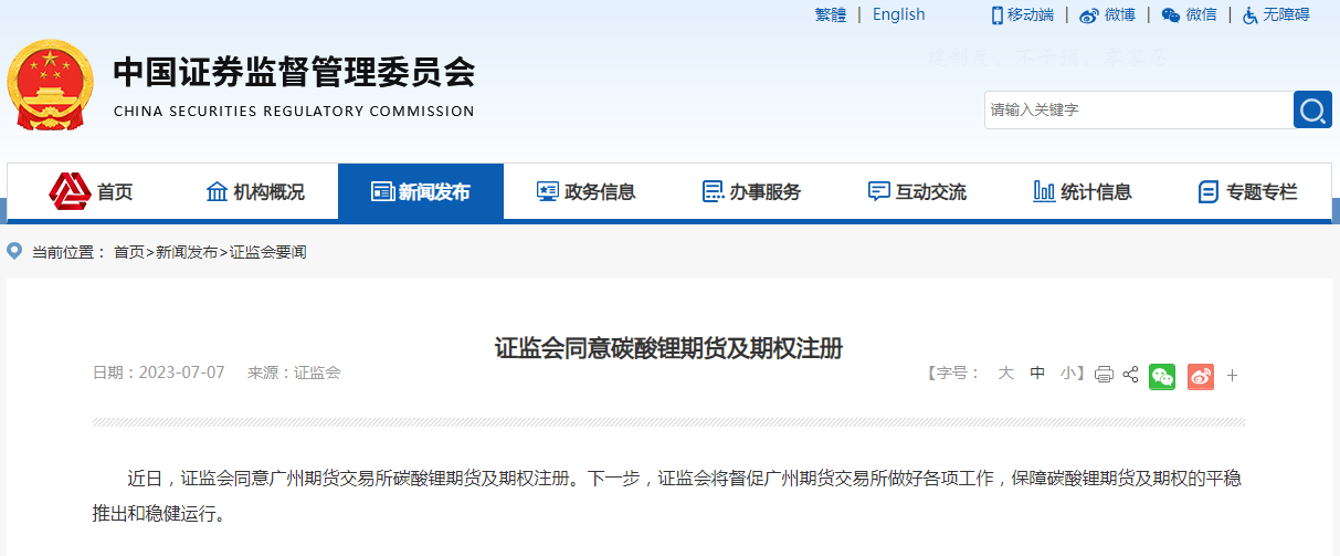近日,证监会同意广州期货交易所碳酸锂期货及期权注册。下一步,证监会将督促广州期货交易所做好各项工作,保障碳酸锂期货及期权的平稳推出和稳健运行。