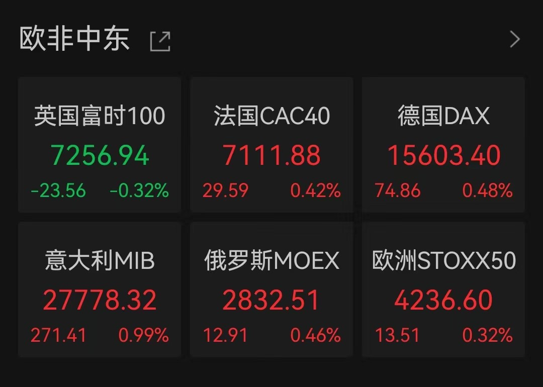 隔夜欧洲股市主要股指涨跌不一。截至当地时间7月7日收盘,英国富时100指数跌0.32%,法国CAC40指数、德国DAX指数分别上涨0.42%和0.48%。