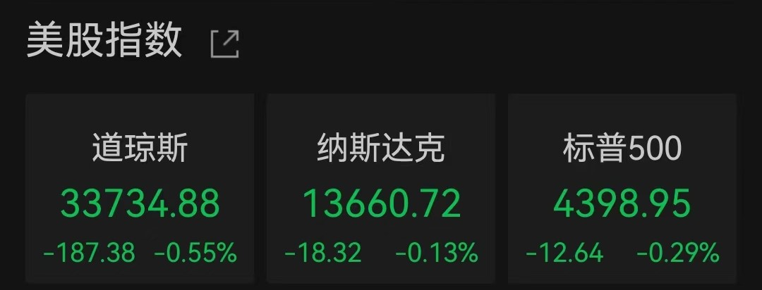 当地时间7月7日,美股三大股指盘中冲高回落,临近尾盘集体收跌。Wind数据显示,截至收盘,道指跌0.55%,报33734.88点;纳指跌0.13%,报13660.72点;标普500指数跌0.29%,报4398.95点。
