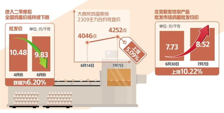 A:当前,一些地方鸡蛋现货价格显著反弹。7月7日,北京新发地农产品批发市场鸡蛋批发均价为8.52元/千克,比上周同期(6月30日)的7.73元/千克上涨10.22%。北京新发地农产品批发市场统计部经理刘通表示,蛋价快速反弹不具有可持续性,仅是正常波动,目前鸡蛋供应仍然充足,没有出现供不应求的状况。