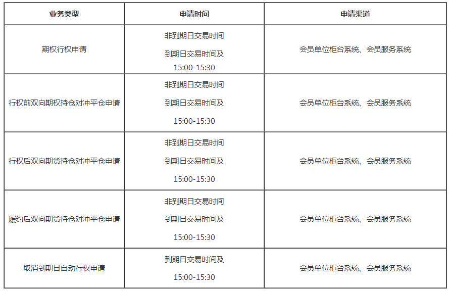 在每个交易日的交易时间以及到期日的15:00-15:30,客户可以提交“行权”、“双向期权持仓对冲平仓”、“行权后双向期货持仓对冲平仓”和“履约后双向期货持仓对冲平仓”申请。