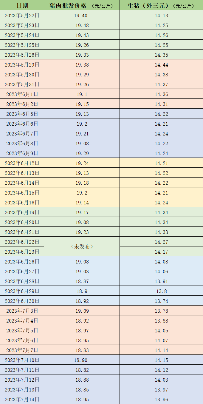 据农业农村部监测,7月14日,全国农产品批发市场猪肉平均价格为18.95元/公斤,与上周五(7月7日)的18.83元/公斤相比,上涨0.6%。本周的平均价格为18.88元/公斤,与上周18.95元/公斤的均价相比,下降0.4%。