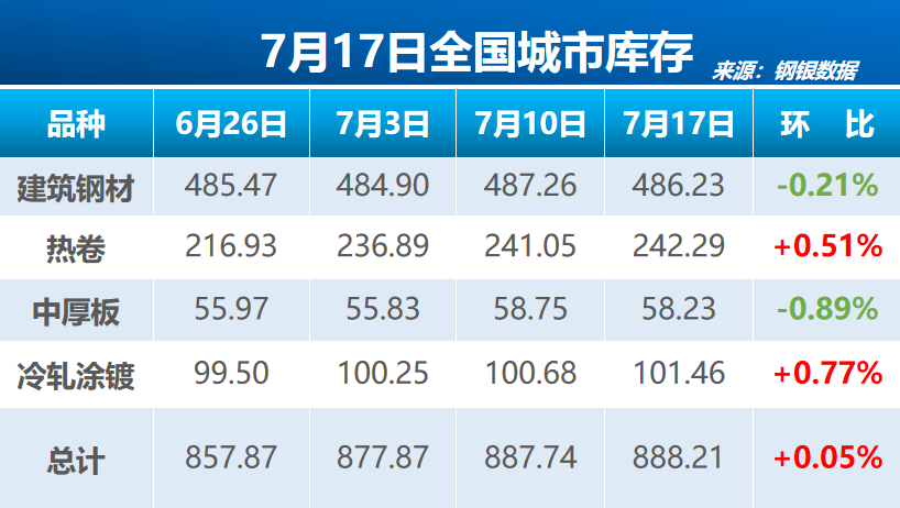 据钢银电商数据显示,截至7月17日,全国钢市总库存量为888.21万吨,较上周环比增加0.47万吨(+0.05%),包含39个城市,共计146个仓库。