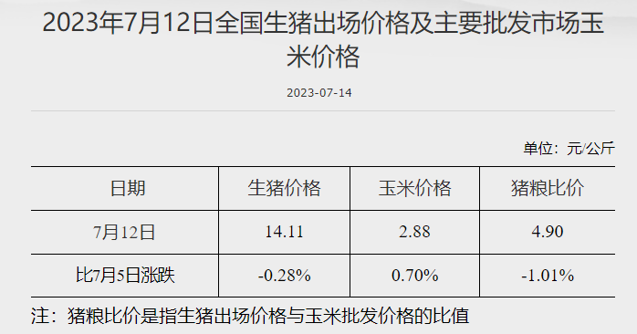 截至7月12日,全国生猪出场价格为14.11元/公斤,比7月5日下跌0.28%;主要批发市场玉米价格为2.88元/公斤,比7月5日上升0.70%;猪粮比价为4.90,比7月5日下跌1.01%。
