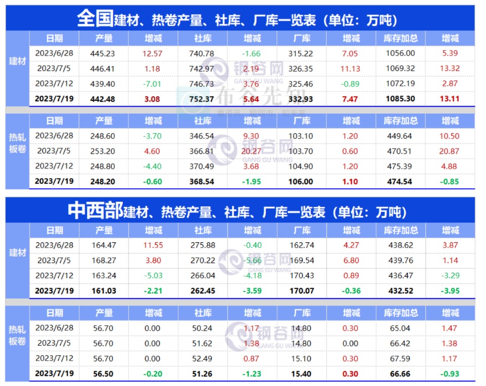 钢谷网数据显示,截至7月19日当周,全国建材社库752.37万吨,较上周增加5.64万吨,上升0.76%;厂库332.93万吨,较上周增加7.47万吨,上升2.30%;产量442.48万吨,较上周增加3.08万吨,上升0.70%。