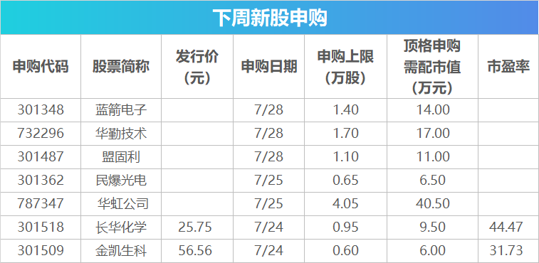 下周,A股将有7只新股发行,其中,7月24日发行的是金凯生科、长华化学;7月25日发行的是民爆光电、华虹公司;7月28日发行的是盟固利、华勤技术、蓝箭电子。