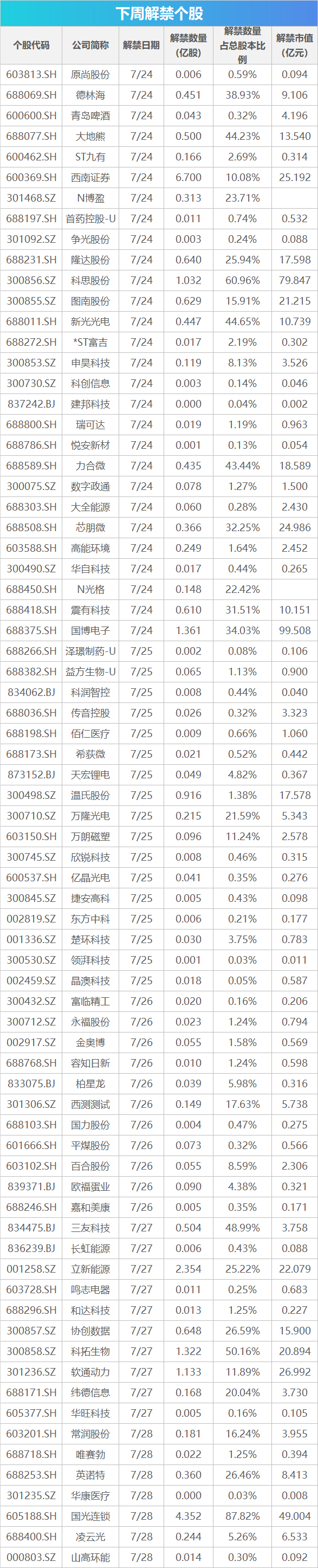 数据统计显示,下周共有71家公司限售股陆续解禁,合计解禁27.34亿股,按7月21日收盘价计算,解禁总市值为555.93亿元。