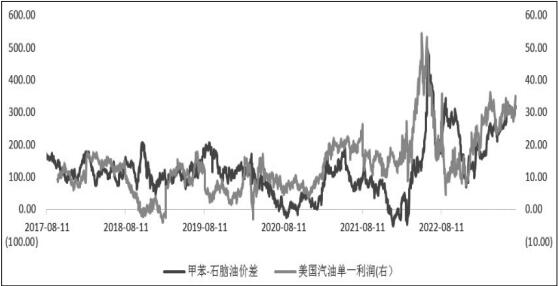 美国汽油库存连续1个月周度累库后,上周再度转为去库存格局,目前库存绝对值水平再次回到近5年来最低水平,从而进一步推动美国汽油单一利润在需求旺季之中仍然保持偏强态势。亚洲高辛烷值调油组分估值也明显走强,以甲苯为例,甲苯与石脑油价差和美国汽油的单一利润走势高度正相关,如果美国调油利润走势能够保持相对高位振荡,那么对于下游的调油组分估值抬升具有一定的支撑作用,从而进一步使得PX价格保持坚挺。从轻重石脑油价差的角度来看,重石脑油对于轻石脑油的Premium较为坚挺,难以压缩PXN。