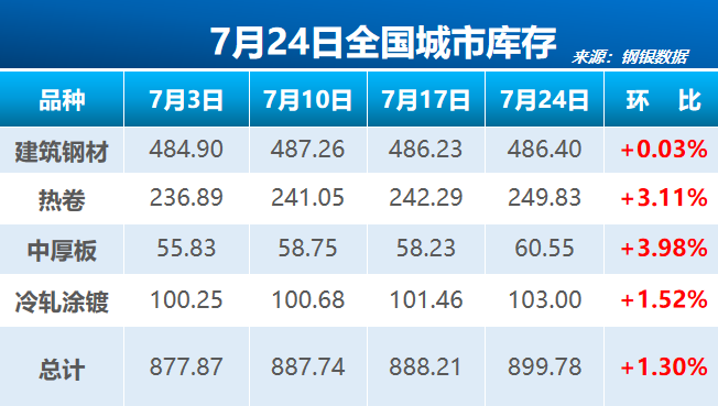 据钢银电商数据显示,截至7月24日,全国钢市总库存量为899.78万吨,较上周环比增加11.57万吨(+1.30%),包含39个城市,共计146个仓库。