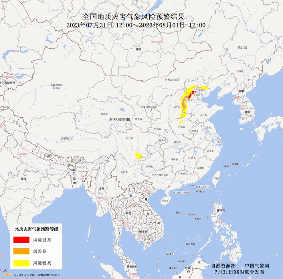 7月31日12时,自然资源部与中国气象局联合发布地质灾害气象风险预警。