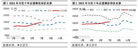 7月份棉纱价格整体走高,且高于十年同期均值,主要因素是预期偏强。据卓创资讯调研,新疆地区棉花播种面积同比下降7.03%,叠加厄尔尼诺等高温天气使得新棉单产仍有下降预期,棉纱成本支撑较强;另外,随着“金九银十”传统消费旺季来临,棉纱需求仍有向好预期,带动棉纱涨价。7月份全国3128B级皮棉均价17513.88元/吨,环比上涨3.22%,同比上涨4.5%;全国普梳高配32支纯棉纱均价24800元/吨,环比上涨1.22%,同比下降2.61%。
