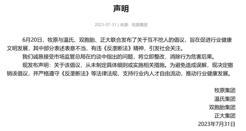 7月31日,牧原、温氏、双胞胎、正大在市场监管总局约谈后发布联合声明称,互不挖人的倡议“旨在促进行业健康文明发展”,从未制定具体细则或实施相关措施。其中部分表述表意不当,有违《反垄断法》精神,“我们诚恳接受市场监管总局在约谈中指出的问题,将立即整改,消除行为危害后果”。