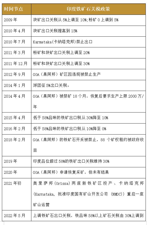 2022年5月,印度政府上调铁矿石出口关税,导致印度铁矿石出口不畅,同年11月,印度政府宣布取消铁矿石出口关税。