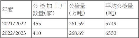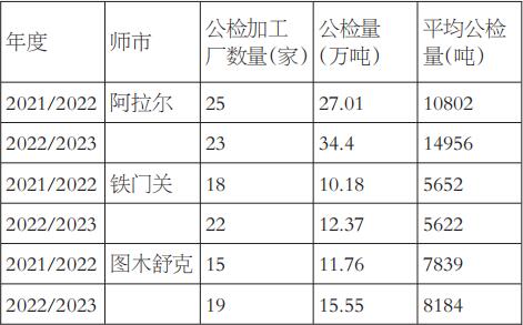 从过去两年的公检情况可以看出,南疆地区(含兵团)分别在2021/2022年度、2022/2023年度由455家、410家轧花厂累计完成皮棉公检261.59万吨、268.69万吨,平均每家轧花厂完成5749吨、6553吨皮棉公检。