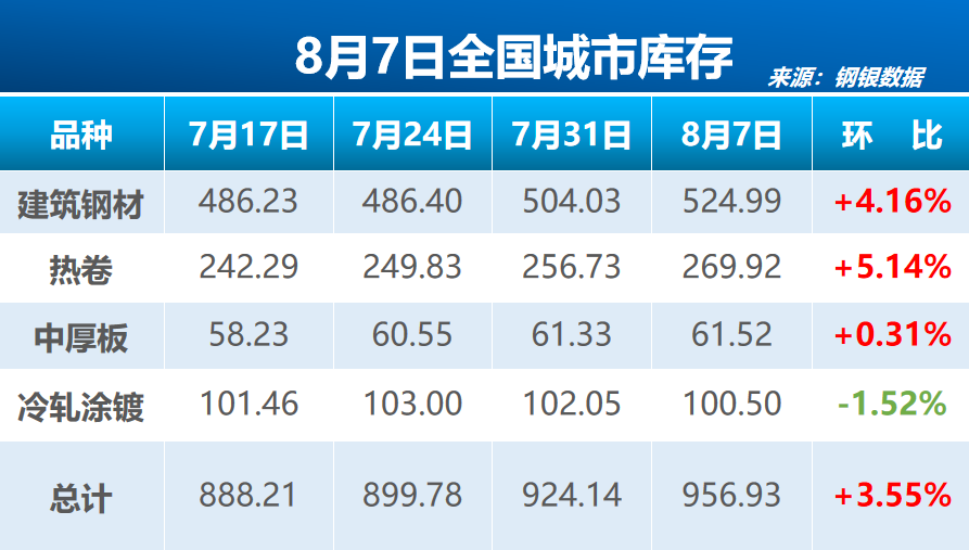 据钢银电商数据显示,截至8月7日,全国钢市总库存量为956.93万吨,较上周环比增加32.79万吨(+3.55%),包含40个城市,共计142个仓库。