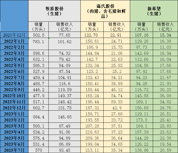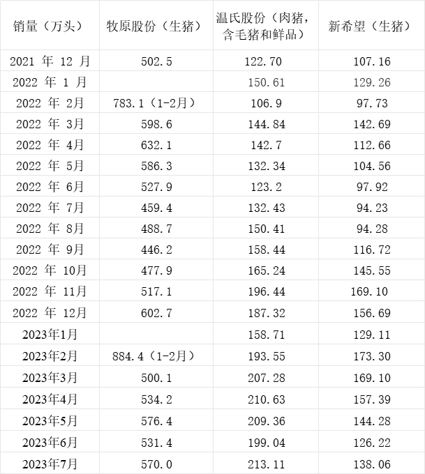 8月7日,上市猪企新希望(000876.SZ)、牧原股份(002714.SZ)、温氏股份(300498.SZ)发布7月的生猪销售简报。