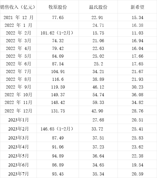 从销售收入来看,三家上市猪企环比均上涨,同比方面,牧原股份、新希望下降,温氏股份上涨。
