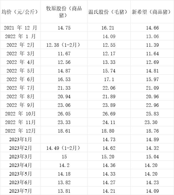 三大猪企7月销售均价环比均小幅下降,下降幅度均小于1%,同比也为下降,下降约35%。