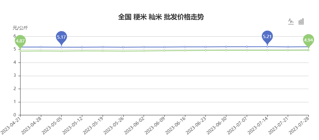 国内方面,大米价格显示出波澜不惊的气度。8月7日,国家商务部发布的全国粳米批发价格均在7元/公斤以下,山东淄博、深圳福田等地批发市场价格低于6元/公斤,全国均价约在5.2元/公斤左右,上下波动仅为0.04元/公斤。籼米批发价格均在7元/公斤以下,河南信阳、四川成都、海南等地批发市场价格低于5元/公斤,全国均价约在4.94元/公斤左右,上下波动仅为0.07元/公斤。