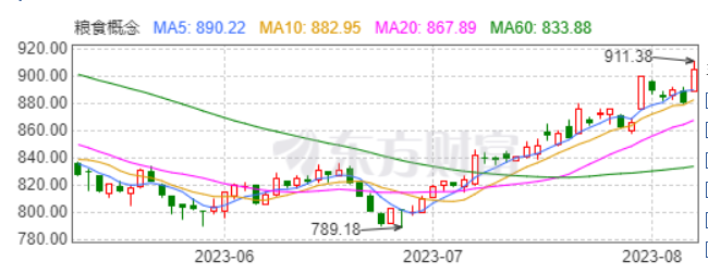 8月7日,东方财富CHOICE终端显示,粮食概念(BK1086)板块再度走强,报收于904.90点,全天涨幅2.73%。神农科技大涨11.17%,金健米业大涨9.98%,报收于涨停板。消息面上,多国限制大米出口,联合国公布相关指数创出近年新高。《证券日报》记者了解到,虽有极端天气等因素影响,但是国内大米供应无虞,米价亦无明显波动,上市公司也建议投资者无需焦虑。
