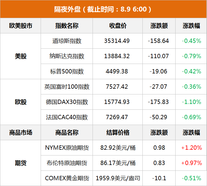 国内期货:8月8日,国内商品期货多数收跌,碳酸锂跌近3%,棕榈油、豆油、LU燃油跌超2%,燃料油、花生、焦煤、菜籽油、沥青跌超1%。尿素、红枣、淀粉、玉米涨超1%。上期所原油期货2309合约夜盘收涨1.34%,报633.50元人民币/桶。沪金夜盘收跌0.09%,沪银收跌0.96%。