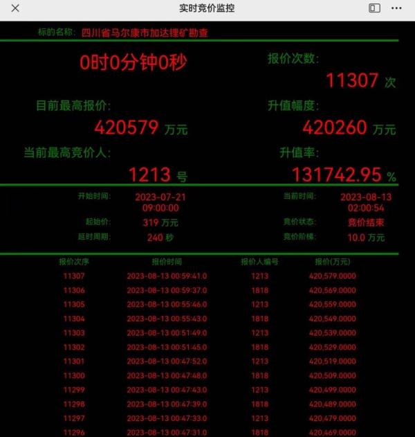 8月13日凌晨59分41秒,历时三天三夜的四川省马尔康市加达锂矿勘探权拍卖落定。