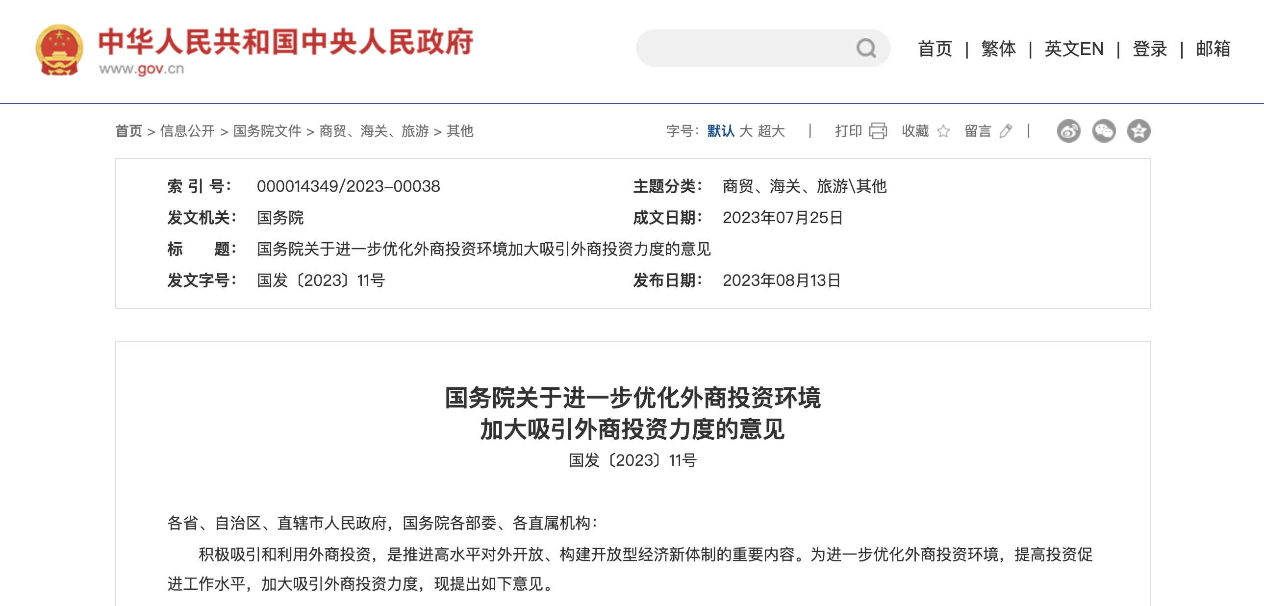8月13日,国务院印发《关于进一步优化外商投资环境加大吸引外商投资力度的意见》。《意见》提出6方面24条政策措施。