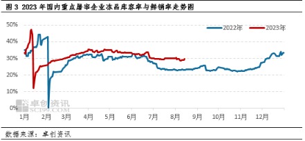 需求方面,由于目前正值消费淡季,终端走货较差,屠宰企业销售有一定压力。同时生猪价格偏高,屠宰企业暂无分割入库意向,部分选择鲜品分割,对开工率的支撑作用较小。除立秋对需求有短暂提振外,8月中上旬屠宰企业需求偏弱,整体窄幅震荡为主。据卓创资讯统计,截至8月14日,国内重点屠宰企业平均开工率为29.67%,环比微涨0.22个百分点,同比提升6.53个百分点。