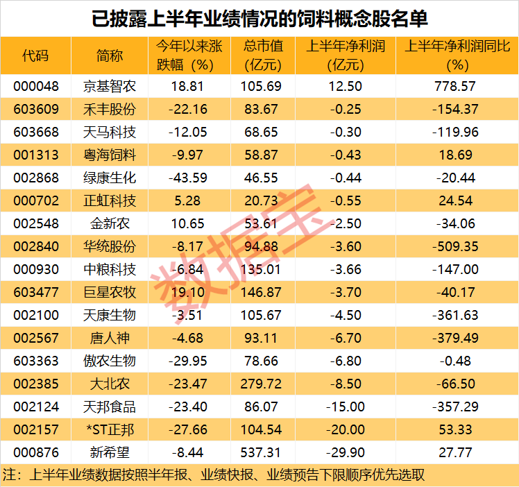 目前已有17只饲料概念股发布了上半年业绩情况,按照半年报和业绩预告下限数据进行统计,仅京基智农上半年实现盈利;公司预计业绩扭亏,预测净利润约12.5亿元~13.5亿元,较去年同期净利润亏损1.84亿元,变化约为778.57%~832.86%。