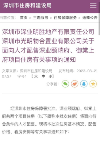 8月21日,深圳市住建局发布关于面向人才配售深业颐瑞府、御棠上府项目住房有关事项的通知,其中原第一、二队列条件不变,增加了第三、四队列,最低门槛由以前的本科学历调整为具有全日制专科学历即可申请;在房源安排上,原来3人仅可申请2房,这次3人家庭可认购两房户型或三房户型住房(认购三房户型住房的为第四队列)。