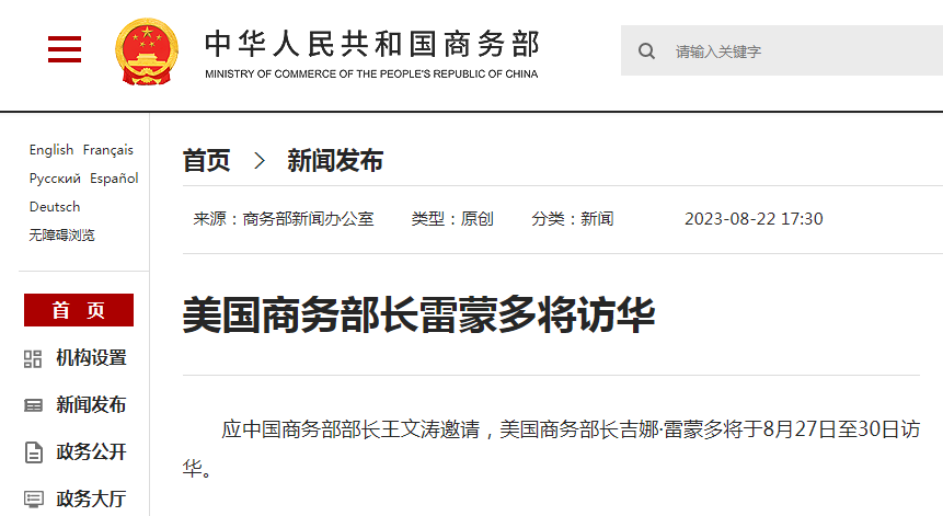 应中国商务部部长王文涛邀请,美国商务部长吉娜·雷蒙多将于8月27日至30日访华。