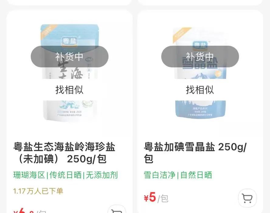 记者查看盒马等多个生鲜电商平台发现,低钠盐、无碘盐显示“缺货”、“补货中”。京东七鲜超市提供的数据据显示,无碘盐从22日至今销量环比增长208%,碘盐销量增长149%。
