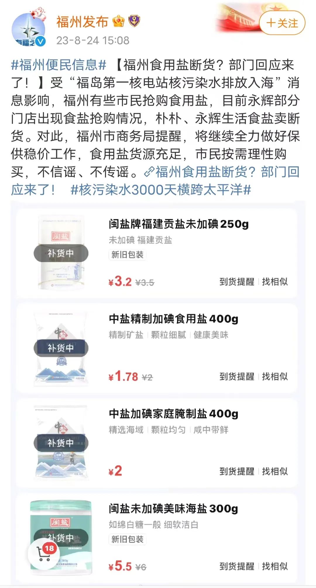 此外,福州发布微博消息,受“福岛第一核电站核污染水排放入海”消息影响,福州有些市民抢购食用盐,目前永辉部分门店出现食盐抢购情况,朴朴、永辉生活食盐卖断货。对此,福州市商务局提醒,将继续全力做好保供稳价工作,食用盐货源充足,市民按需理性购买,不信谣、不传谣。