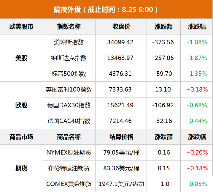 美股:标普500指数收跌59.70点,跌幅1.35%,报4376.31点。道指收跌373.56点,跌幅1.08%,报34099.42点。纳指收跌257.06点,跌幅1.87%,报13463.97点。
