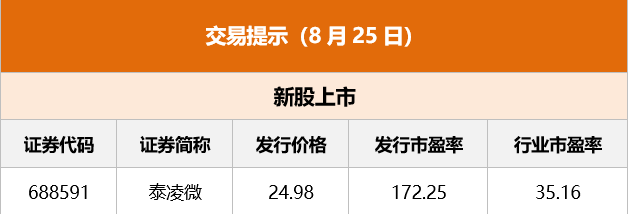 龙虎榜:8月24日,日内上榜龙虎榜个股中,资金净流入最多的是紫光国微,为3.81亿元。机构参与龙虎榜中个券共涉及29只(1只可转债),其中9股被机构净买入,紫光国微被买入最多,为9916.26万元。另外20只个券(1只可转债)被机构净卖出,零点有数被卖出最多,为6819.41万元。