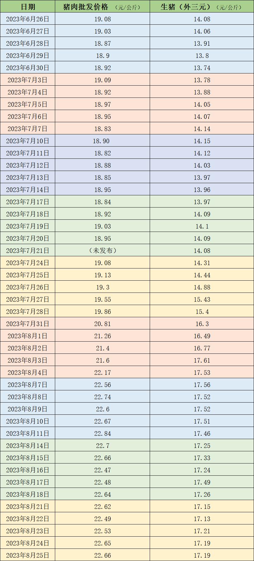 据农业农村部监测,8月25日,全国农产品批发市场猪肉平均价格为22.66元/公斤,与上周五(8月18日)的22.64元/公斤相比,基本持平。7月下旬以来,猪肉价格逐渐上涨。8月25日的22.66元/公斤与上个月同期的19.13元/公斤相比,上涨了18.5%。本周的平均价格为22.59元/公斤,与上周22.59元/公斤的均价相比,持平。