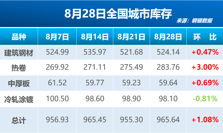 钢银电商28日公布数据显示,截至8月28日的一周,全国39个城市,共计146个仓库的城市钢材总库存量为965.64万吨,较上周增加10.34万吨,增幅1.08%。