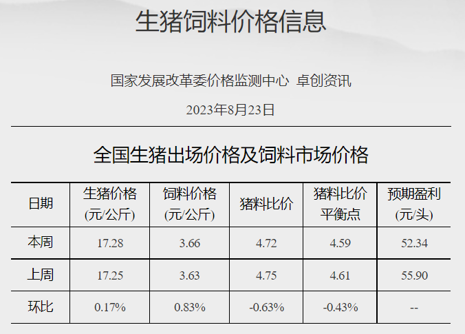 国家发展改革委价格监测中心28日发布,本周(截至8月23日当周)全国猪料比价为4.72,环比下降0.63%。按目前价格及成本推算,未来生猪养殖头均盈利为52.34元。