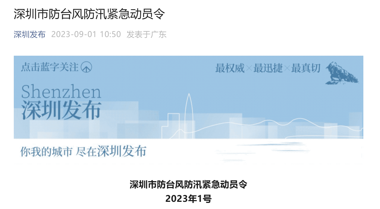 据深圳发布9月1日消息,深圳市发布防台风防汛紧急动员令。