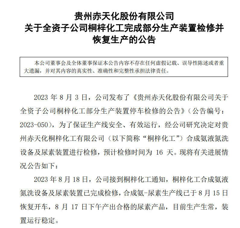 赤天化8月19日曾发布公告称,8月3日对贵州赤天化桐梓化工有限公司(以下简称桐梓化工)合成氨液氮洗设备及尿素装置进行检修,8月18日,公司接到桐梓化工通知,桐梓化工合成氨液氮洗设备及尿素装置已完成检修,合成氨-尿素生产线已于8月15日恢复开车,8月17日下午产出合格的尿素产品,目前生产正常,装置运行稳定。