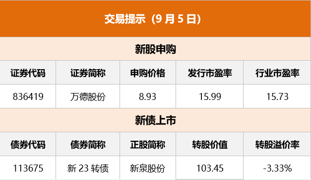 国债:9月4日,2年期国债期货主力合约TS2312下行0.04%至101.265;5年期国债期货主力合约TF2312下行0.10%至102.020;10年期国债期货主力合约T2312下行0.19%至101.945。10年期国债利率涨2.74BP,至2.61%;10年期国开债利率涨2.25BP,至2.74%。