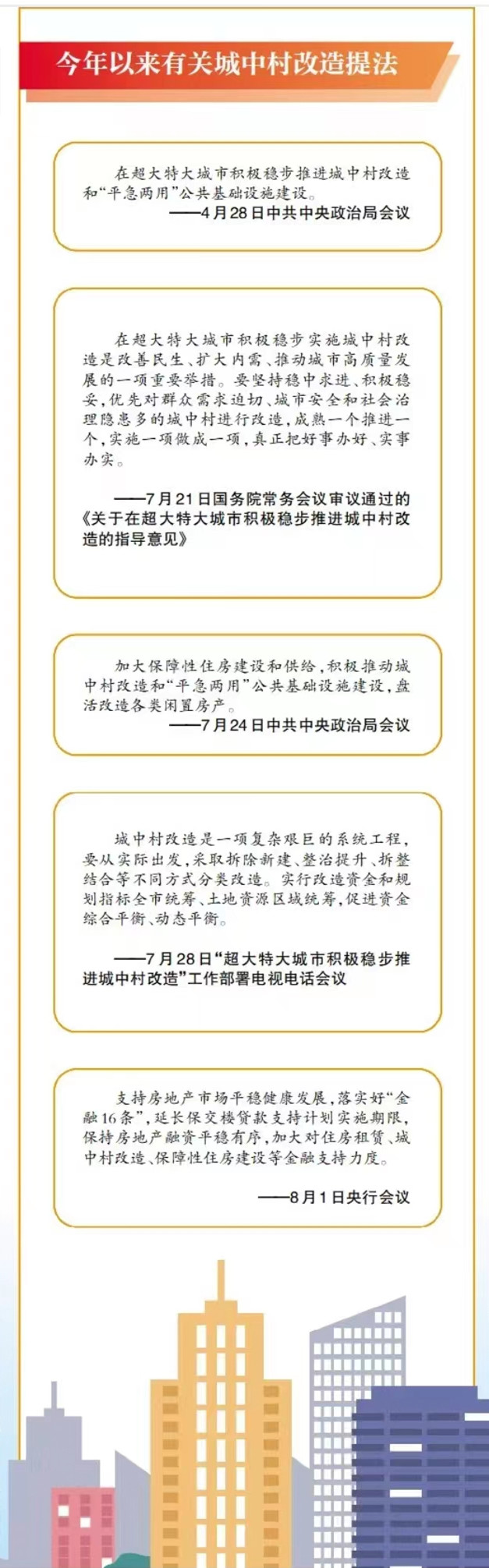 7月21日,国务院常务会议审议通过《指导意见》。7月24日召开的中央政治局会议指出,要加大保障性住房建设和供给,积极推动城中村改造,盘活改造各类闲置房产。7月28日,超大特大城市积极稳步推进城中村改造工作部署电视电话会议在北京召开。此外,8月1日举行的央行会议也提到加大对城中村改造的金融支持。