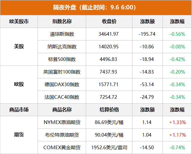 美股:标普500指数收跌18.94点,跌幅0.42%,报4496.83点。道指收跌195.74点,跌幅0.56%,报34641.97点。纳指收跌10.86点,跌幅0.08%,报14020.95点。