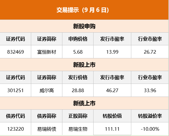 龙虎榜:9月5日,日内上榜龙虎榜个股中,资金净流入最多的是华力创通,为2.41亿元。机构参与龙虎榜中个券共涉及29只(1只可转债),其中7股被机构净买入,华海诚科被买入最多,为2307.88万元。另外22只个券(1只可转债)被机构净卖出,人民网被卖出最多,为3.05亿元。
