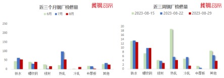 钢材生产方面,截至8月30日,找钢网跟踪调研的国内钢材周度总产量为800.82万吨,月环比上升14.69万吨,环比增幅1.9%。