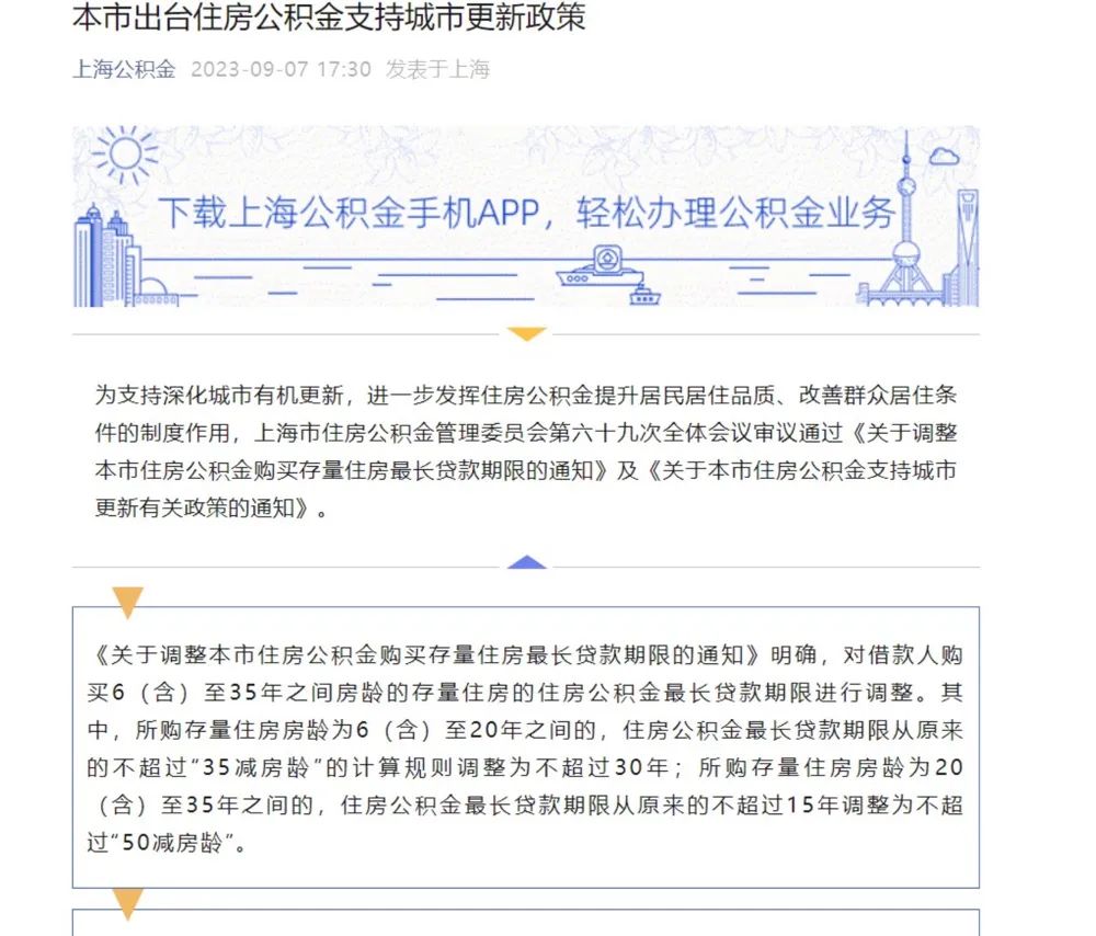 9月7日,上海公积金管理委员会宣布调整公积金购买存量住房最长贷款期限,自10月7日起施行。根据新政,上海二手房公积金贷款期限最长可达30年,在业内人士看来,这意味着在新一轮购房政策宽松期中,上海公积金政策继续发力,且超出了传统的额度增加等范畴。