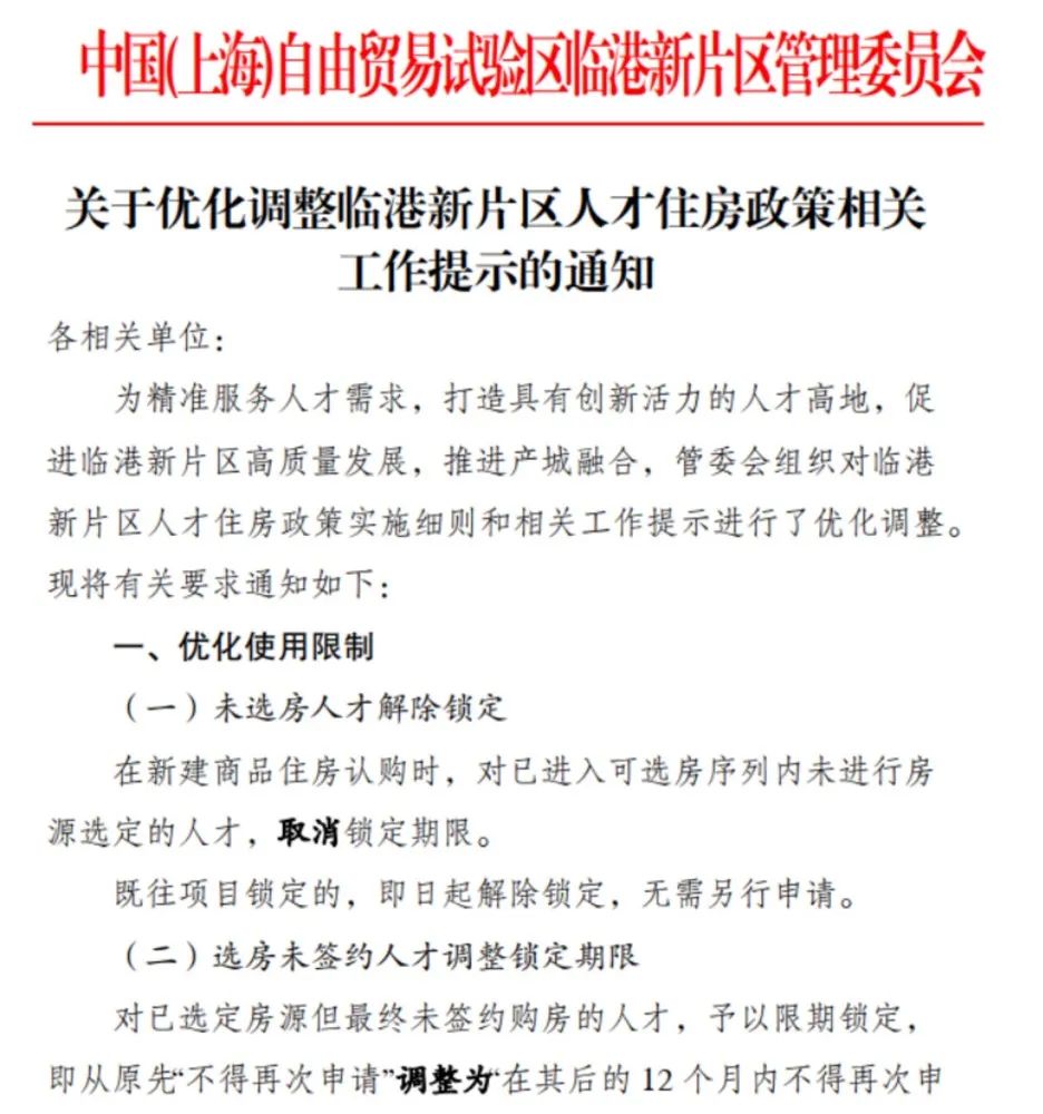 同日,上海临港新片区也发布《关于优化调整临港新片区人才住房政策相关工作提示的通知》,再次优化人才住房政策。
