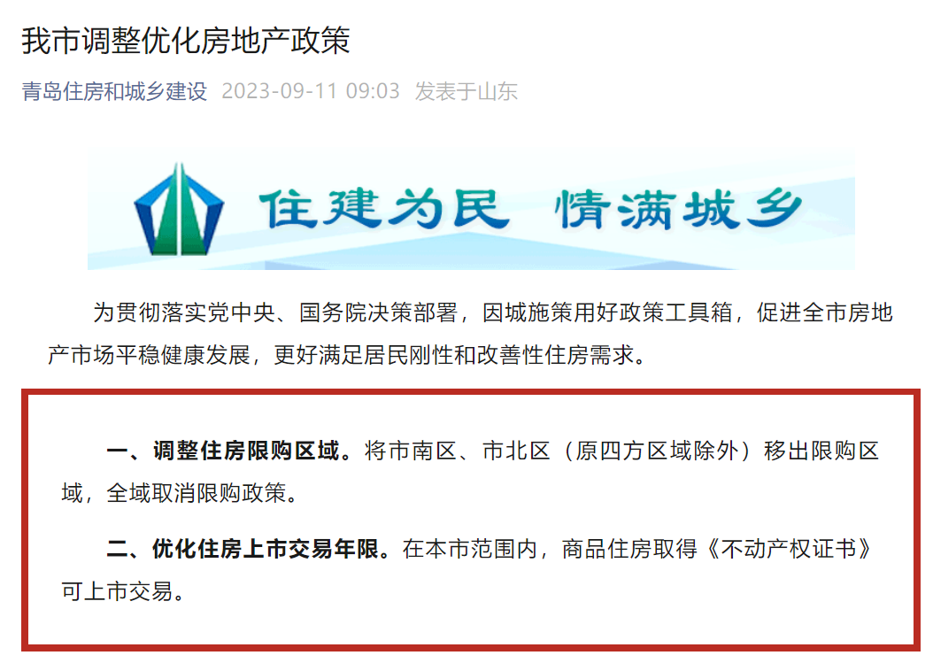 9月11日,青岛市住房和城乡建设局官微发布《我市调整优化房地产政策》,将市南区、市北区(原四方区域除外)移出限购区域,全域取消限购政策。同日,据媒体报道,济南市从即日起全域取消限购。